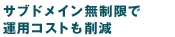 | 近年、企業の製品カテゴリや利用目的に合わせてサブドメイン名を利用するケースが増えています。THE マルチドム 4000なら無制限にサブドメイン・ドメインを設定し運用いただくことができます。 | 月額料金は定額制ですのでデータ転送量を気にすることなく安心してお使いいただけます。回線はなんと1Gbpsでの共有です! |